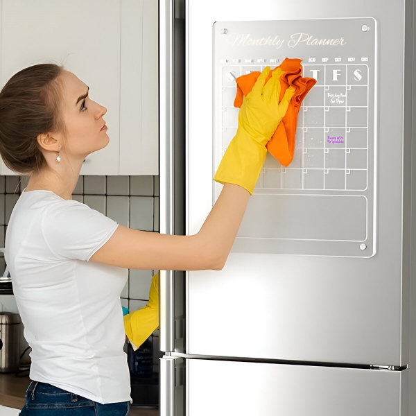 Meie akrüülkalendril on tugev magnetiline jõud. Kui teil on vaja seda uuesti paigaldada, veenduge, et järgite õiget eemaldamisprotseduuri. Vältige selle otse alla tõmbamist, sest see võib jahuti kriimustada. Olge ettevaatlik ja käsitsege kalendrit ettevaatlikult.
