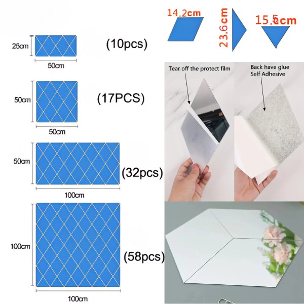Kasutage 32 kleebist kolmes suuruses, et luua unikaalseid kujundusi. Korraldage need 50 x 100 cm ristkülikuks või kohandage paigutus vastavalt oma stiilile. Võimalused on lõputud, kas soovite luua statement-seinad, rõhutada mööblit või lisada laele ja ustele elegantsi.