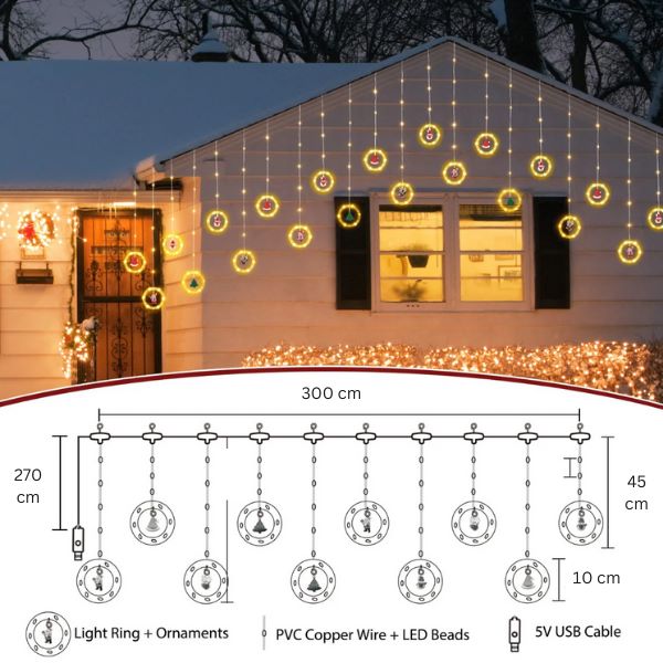 Õrnalt läbipaistvatesse rõngastesse hoolikalt paigutatud helendavad tuled loovad lummava atmosfääri, pannes samal ajal rippuvad figuurid säravalt särama.